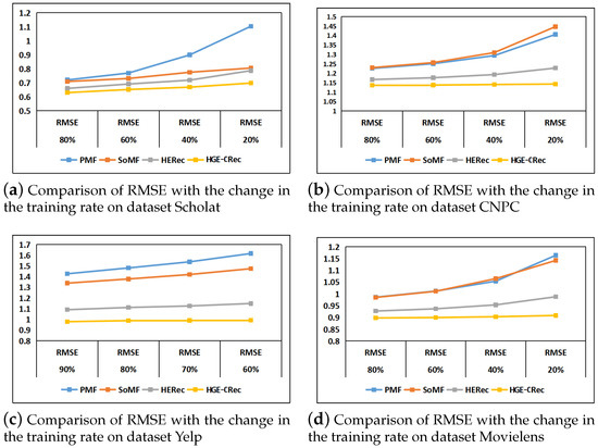 Comparison of RMSE with the change in the training rate on four datasets.