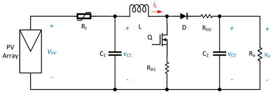 In Petri nets theory, four basic elements can be identify: place (circle), transition (rectangle), arc (arrow) and token (dot), they are associated with DCMG elements in a specific way. A place can represent as one of the following options: a tandem boost PV array and boost PEC (–), a DC–DC full bridge PEC and the electronic load () or six LED luminaries (), ESSs battery charger PEC (–), also primary bus and secondary bus are considered (, ) places, but they are not able to store power more than one period of time. A transition represents the enable signal of a PEC, since Petri net point of view, an active transition allows the power flow (–). An arc is the medium through power flows, it also indicates the direction of the flow. A token represents a power unit (W, kW, etc.). The places – are connected to the respective bus through two trajectories arc and transition. One transition is activated if boost converter operates with feedback state controller in closed loop, voltage regulation mode. The other transition is turned on when this kind of PEC operates in MPPT mode.