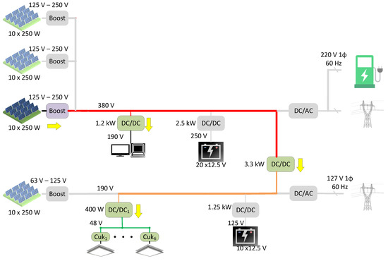 As supervisory control level, an EMS is included to control the multibus multivoltage DCMG. The main idea to design the EMS is to perform in a similar way to an industrial production system. The EMS is programmed in a central concentrator (CC) hardware; from here, enable signals are generated in order to harness all the energy harvested in PV arrays in various consumption points of the system. In order to reach harmonic performance of the DCMG, a list of loads priorities have to be met: