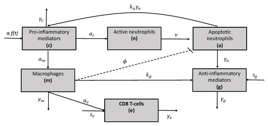 - Reynolds, A.; Rubin, J.; Clermont, G.; Day, J.; Vodovotz, Y.; Ermentrout, G.B. A reduced mathematical model of the acute inflammatory response: I. Derivation of model and analysis of anti-inflammation. J. Theor. Biol. 2006, 242, 220–236. [Google Scholar] [CrossRef] [PubMed]