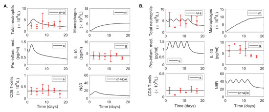 Data fitting results. Dynamics of variables defined by model Equation (3) over time for parameters in Table 1 and Table 2 versus immunological data (red circles) in (A) mild and (B) severe COVID-19 infections. Time represents days post hospital admission. Error bars represent mean ± standard deviation where total neutrophil and CD8 T-cell data are given in and IL-10 data in pg/mL as in [61].