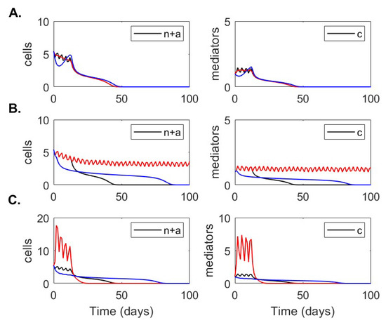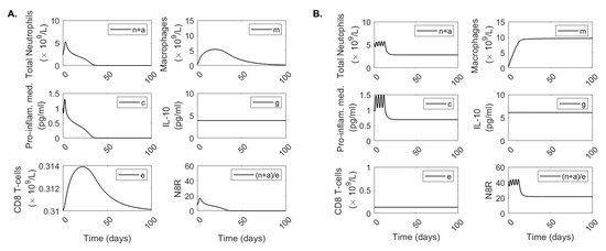 Using the parameters in Table 1 and Table 2 (severe case) we plotted the semirelative curves given by which showed large effect of on the neutrophil, macrophage and proinflammatory populations and weak effect on anti-inflammatory and CD8 T-cell populations (see Figure A2).