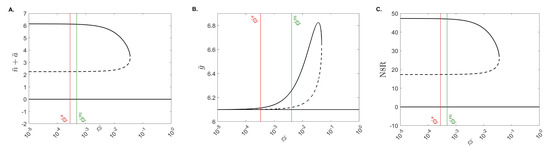 The bifurcation diagram. Stable (solid black curves) and unstable (dashed black curves) population equilibria for varied for (A) total neutrophils , (B) IL-10 , and (C) N8R . The green and red lines are the values from the mild and severe cases, and .