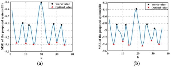 In Figure 4, it can be seen that the delay unit k can affect the stability under different FMs. When the delay unit k is changed, the convergence rate and steady-state performance of the proposed system are also affected. The symbol of the red triangle represents that the k value will lead to an optimal MSE of the system, but the black circle is the opposite. When k is set to 3, 11, 17, 24 or 31, it is easy to cause the decline of the system performance in dealing with 15% FM, as shown in Figure 4d; k = 9, 10 or 27 will result in system divergence, and k = 8, 14, 20 or 32 will obtain a better performance. Hence, it is essential to place the above analysis in the first consideration to choose an appropriate value. Based on the existing results, it is clear that k = 14 is able to achieve the best MSE over the others under different FMs, as shown in Table 1. We therefore set the value of k to 14 for obtaining a good system performance in different cases.