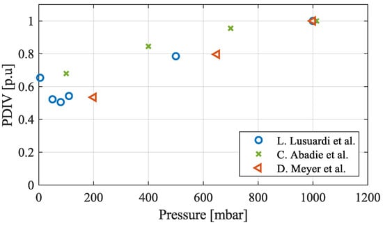 In addition, C. Abadie et al. [27] note that the increase in pressure in from 100 to 1013 mbar increases the PDIV for twisted pairs. D. Meyer et al. [28] obtained the same influence of the pressure in a range of 200–1000 mbar on RPDIV. The results reported in the mentioned studies [26,27,28] are compared in Figure 1. The PDIV results are normalised to 1000/1013 mbar and are depicted in a pressure range from 5 to 1013 mbar. In this case, the characteristic U shape is only seen in the results from [26], as the minimum PDIV value is at around 50–70 mbar and [27,28] measured above this pressure.
