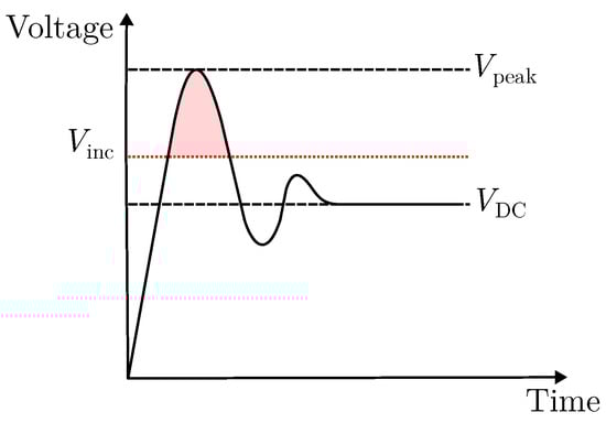 The differences between the use of sinusoidal and square waveforms, either unipolar or bipolar, to define the PDIV of twisted pairs have been studied by different authors. It is worth mentioning that, in the studied cases, the PDIV is defined by increasing the voltage at a constant rate until the PD activity is detected. In [26], after observing PDIV experimental data for sinusoidal and bipolar square waveforms, it is concluded that only the peak value of the applied voltage is important for the definition of the PDIV, whereas the waveform does not affect the PDIV. It is explained that an error in the definition of the PDIV could arise when measuring using impulse bipolar voltages due to overshooting. Figure 2 depicts a situation where the peak voltage exceeds the ignition voltage () and the PD could happen in any voltage level of the overshoot, as long as there is a free electron available to start the avalanche.