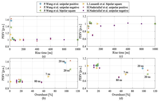 In Figure 3, the peak and DC PDIV are collected depending on the rise time and overshoot percentage. Focusing on Figure 3a, it can be seen that, independent of the waveform and its polarity (bipolar or unipolar positive and negative), for a rise time above 20 ns, constant peak PDIV values were obtained. On the contrary, for lower rise times, there was a general increasing effect. For some researchers, this inflexion point was below 20 ns [45], whereas for others it was below 15 ns [26]. Moving to Figure 3b, the DC PDIV showed a similar effect but with a decreasing tendency. The change from a constant to an increasing/decreasing effect of the PDIV comes with a considerable increase in overvoltage. The relationship between the PDIV and the overshoot is depicted in Figure 3c,d. At low overshoots, there is no considerable effect on the peak and DC PDIV, as there is at high overshoots, which correspond to 7 ns [26], 20 ns, [45] and 80 ns [54] rise times.