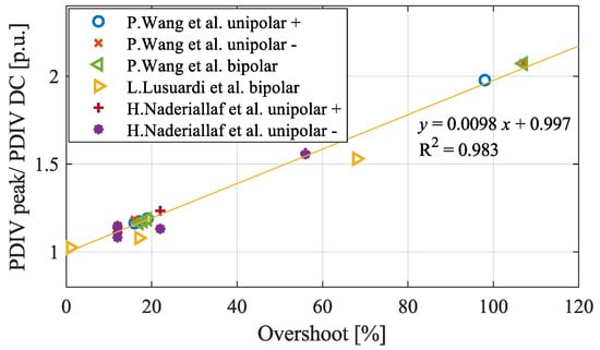 Figure 4 summarises the relationship between the peak and DC PDIV, depending on the overshoot. A linear relationship is evident. The difference between the peak and DC PDIV value increased with the waveform overshoot.