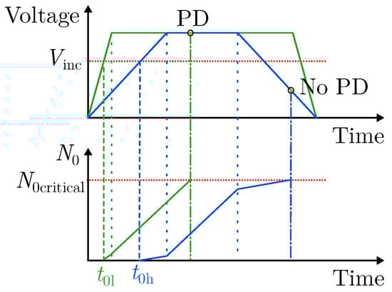 Based on the theoretical explanations provided by the authors of [43], a simplified schematic representation is depicted in Figure 5. For a fixed pulse width, two rise times are represented. For a lower rise time, the ignition voltage is reached earlier and electron generation starts earlier (). The electrons have enough time to reach a critical value and develop the PD activity. On the contrary, for a higher rise time, in addition to a later electron generation starting (), the generation rate is slower and, therefore, by the time critical is achieved, the applied voltage can be at a lower level than at inception, thereby avoiding PD, and the PDIV can be set to a higher voltage level.
