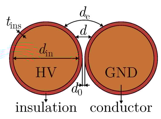 - In the general use of Paschen’s law (using parallel plate electrodes), for a given pressure, the first ionisation phenomena () is considered constant in the distance , defining as the perpendicular distance between electrode surfaces. Several authors have used the same definition to model the PDIV on twisted pairs with FEM simulations [60,68,69] or analytical models [59]. Indeed, the difference between the real and straight field length has been shown to be lower than 1% for small distances, while it is about 7% for distances larger than 50 [69]. Adversely, Gómez de la Calle et al. [70] stated that this simplification of assuming a constant effective first ionisation phenomenon is not correct for this specified geometry. In twisted pairs, the path defined by the perpendicular distance between wires does not match with the path followed by the electric field lines. Therefore, this approach is questioned.