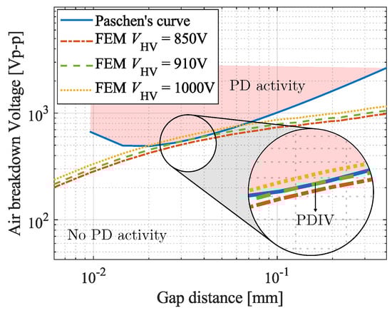 - Collin, P.; Malec, D.; Lefevre, Y. About the relevance of using Paschen’s criterion for partial discharges inception voltage (PDIV) estimation when designing the electrical insulation system of inverter fed motors. In Proceedings of the 2019 IEEE Electrical Insulation Conference (EIC), Calgary, AB, Canada, 16–19 June 2019; pp. 513–516. [Google Scholar] [CrossRef]