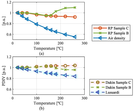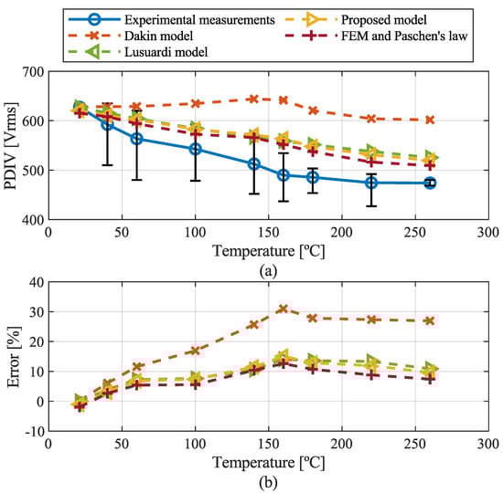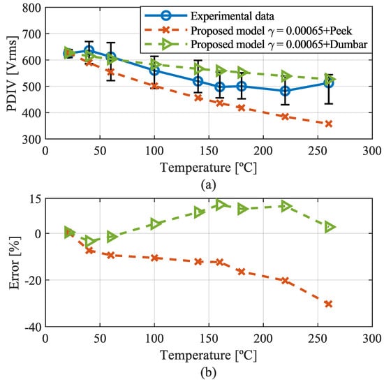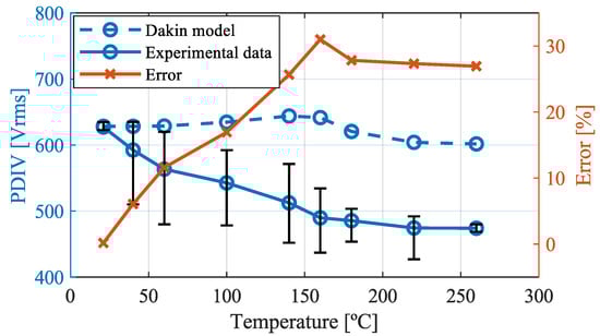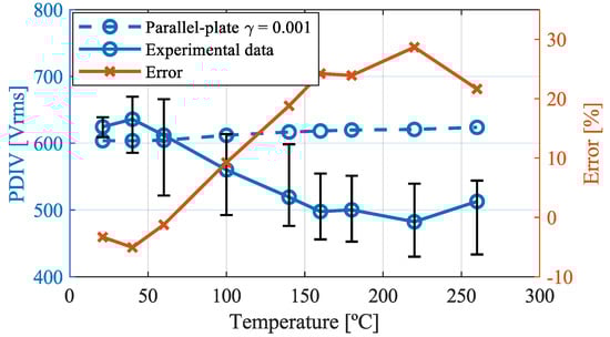 Considering these studies, it is clear that there is an inverse relationship between temperature and PDIV due to air electric breakdown voltage decrease. However, in view of relative permittivity, the PDIV evolution can be analogous or inverse to the temperature. Thus, when the relative permittivity decreases with the temperature, both factors, air and permittivity, have an opposite effect on the PDIV. In this case, it is necessary to decide whether air properties or relative permittivity is the predominant factor to define the evolution of the PDIV with temperature.