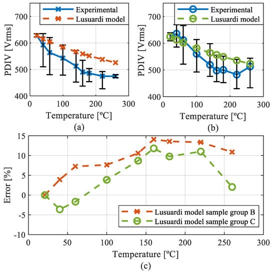 Moving to the insulation properties, D. Muto et al. [38] observed that an increase in relative permittivity with temperature (in the range 25–230 C) decreased the PDIV. Different insulation materials (Polyamide-imide (PAI) and Polyetheretherketone (PEEK)) with different permittivity–temperature relationships that (increase the relative permittivity with temperature) are analysed. It is shown that not only are changes in air density dominant but also the evolution of permittivity with temperature must be considered. These conclusions are in good agreement with [42]. It must be kept in mind that, depending on the material, the relative permittivity can increase or decrease with temperature. Therefore, depending on the relative permittivity evolution, the PDIV will increase or decrease with the temperature. On the contrary, L. Lusuardi et al. [26] did not notice a considerable dependency on PAI in the range of 25–140 C. They explained that the analysed temperature is well below the glass transition temperature (275 C), so the dependency of the relative permittivity on the temperature is limited. In insulation materials with lower glass temperatures, the temperature dependency could be enhanced.