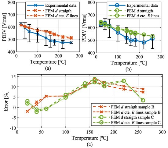 Finally, Y. Kemari et al. [73] proposed a different method for estimation. In a similar way to [70], the electric field lines and scalar potential were computed using FEM. Then, the results were integrated into self-developed software to predict the PDIV using Townsend’s theory in a range of from to . The was interpolated for the defined experimentally PDIV. This way, was proposed for the PI (Poly-imide). In this case, the dependency on the temperature was also studied, showing an increasing tendency, contrary to [70], but with a negligible variation. Moreover, using approximated at 20 C for temperatures up to 200 C to predict the PDIV did not lead to an appreciable difference, which is in agreement with [70].