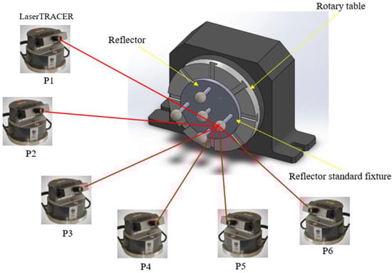 As shown in Figure 1, the reflectors with the reflector standard fixture were mounted on the rotary table, and the LaserTRACER was installed at different base stations externally to the measured rotary table for the 6-DOF geometric error measurements. Moreover, Pi (i = 1–6) in Figure 1 represents the six different LaserTRACER base stations, even though, according to the literature, using four different reflector positions and LaserTRACER base stations are enough to calibrate the 6-DOF geometric errors of a rotary table. However, for a much better convergence of the measurement equations, the original principle of multi-station and time-sharing measurements was improved and utilized in this paper. Consequently, six different reflector positions and six different LaserTRACER base stations were used in this paper to identify the position and orientation of the rotary table.