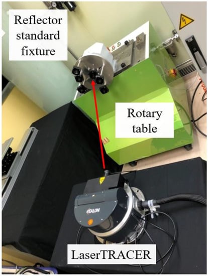 As shown in Figure 2, the proposed measurement method was demonstrated on a commercial rotary table and executed by using the LaserTRACER (etalon AG, Braunschweig, Germany) and the reflector standard fixture with the reflectors. The validation experiment for the feasibility and performance of the proposed measurement system was executed using the LaserTRACER and the laboratory-built prototype of the reflector standard fixture. Furthermore, a comparison test was also implemented by using a traditional dial indicator method and the proposed measurement method.