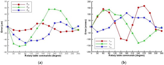 Figure 5. Identified geometric errors of rotary table (a) linear errors and (b) angular errors.