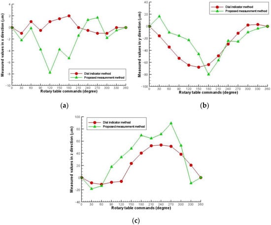 Until now, there has not been any commercial measurement system available for identifying the 6-DOF geometric errors of rotary tables without using three-axis machine tools. As a result, a comparison test was performed by using the traditional dial indicator method and the proposed measurement method. Figure 6 shows the verification experiment when using the traditional dial indicator method for rotary table measurements. However, the dial indicator is only capable of measuring in a specific direction. In other words, the real positions of the rotary table in the x, y, and z directions can be measured and obtained only by using the dial indicator method. As a result, the comparative test results of the proposed measurement method and the dial indicator method are shown in Figure 7. Moreover, for evaluating the effectiveness of the proposed measurement method, the En-score is adopted for estimating how closely the proposed measurement method agrees with the traditional measurement method. According to ISO 13528 [43], the En-score of the measurement results in the x, y, and z directions can be expressed as follows: