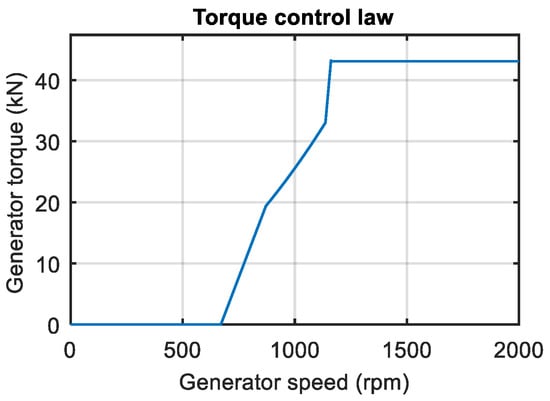 Usually, the control system of wind turbines, as indicated in [], consists of two sub-controllers: a generator torque controller and a controller for the pitch of all the blades based on traditional control techniques. The simulation model also has a control system based on those two subsystems. Since the first one acts when the generator speed is below the nominal value and the second one acts when it is above, those two controllers are designed to work practically in an independent yet complementary manner. Thus, the objective of the first one is to capture as much wind power as possible using an MPPT algorithm, implemented by a torque control law (Figure 1), while the second one regulates the generator speed when the operation is above the nominal generator speed with changes in the collective pitch angles, which often happens when the wind speed is higher than its nominal value.