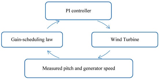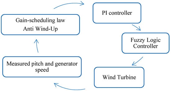 It is in the second control system, the traditional pitch controller (Figure 2), that there is room for improving the system performance with the integration of intelligent control techniques, e.g., fuzzy logic control. It is worth noting that the reference control system is based on a Proportional-Integral controller, developed by the NREL, that has dynamic gains that depend on the actual value of the pitch blades. This architecture is usually known as “gain scheduling” and it is based on expert knowledge of the NREL.