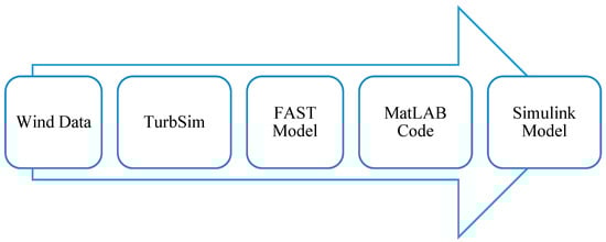 A key aspect of the applied methodology is the implementation of a simulation tool integrating all the necessary components. Firstly, measured wind data are sent to the TurbSim 1.21 software (a stochastic, full-field, turbulence simulator) to produce wind profile data in a suitable format for FAST []. FAST is a computer-aided engineering (CAE) software provided by the NREL that allows users to simulate the behavior of horizontal axis wind turbines, which can be integrated with MATLAB/Simulink. These wind profiles are one of the most relevant inputs of a FAST simulation model, whose execution produces the outputs of the simulated system (Figure 3 shows the sequence of the stand-alone tools used in this work). The integration of these tools enables the applied methodology, supporting the controllers’ development stage and allowing their simulation to generate the necessary data in order to evaluate the controller using performance indexes according to the OC4 simulation model [,].