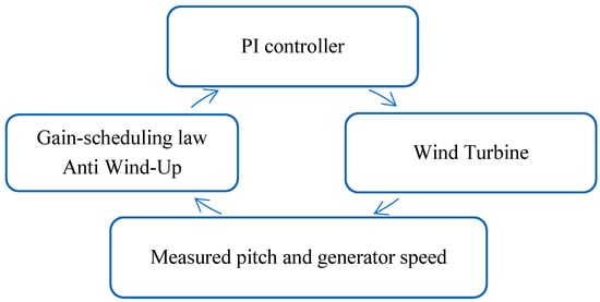 The baseline PI acts on the tracking error of the reference for the generator speed, and it presents a gain-scheduling law that depends on the actual value of the collective pitch. The addition of an Anti Wind-Up method (Figure 4) improved this PI performance according to the aforementioned indexes []. The original PI is described in detail in [,], and the improved PI and its implementation for simulation is presented in [].