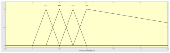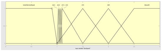 The membership functions for the generator speed input were defined with respect to several relevant speed values above the nominal value, as shown in Figure 6. A normalization with regard to the nominal generator speed is applied. This is reflected in the name of the sets, were A5.0 means a membership function centered on a speed of 5.0% higher than nominal speed, as shown in Figure 7 and summarized in Table 2.