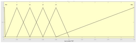 For the improved PI pitch reference input, the behavior of that PI was studied under different operating scenarios, resulting in the division of possible pitch values into some ranges (Figure 8). These ranges are meant to approximate the non-linear relationships that exist between a hypothetical steady wind speed value and the pitch required to achieve a stable response from the wind turbine operating at that wind speed. The names of the membership functions (Figure 9) reflect these ranges as levels (L1, L2, etc.). Table 3 lists these functions.
