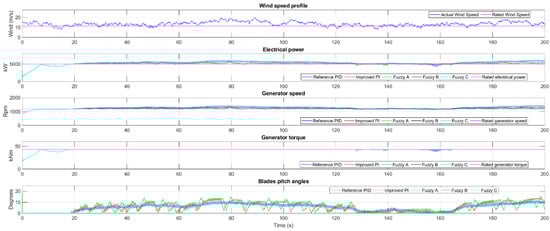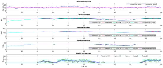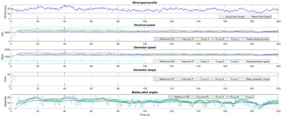 As the wind speed is far above the nominal value all the time, the generator speed rises extremely fast above the rated speed if the pitch is not incremented accordingly, which happens under the baseline PI (see Figure 16). The improved PI is not fully capable of producing a pitch reference as fast as the wind speed changes. However, it can limit the amount the generator speed exceeds the nominal value, which the NREL PI cannot. It is easy to notice the enhancement produced by fuzzy logic controller A with respect to the two PIs. The generator speed is close to the reference, and the speed tracking error is set to a low limit. As in the previous scenario, Fuzzy B offers a poorer performance than Fuzzy A, though its topology provides more flexibility and improves the baseline PI. Finally, Fuzzy C offers a performance as good as Fuzzy A. It is capable of a lower amount of speed tracking error yet is more unstable than Fuzzy A. These differences are due to the fact that the said two controllers were developed with two totally different topologies.