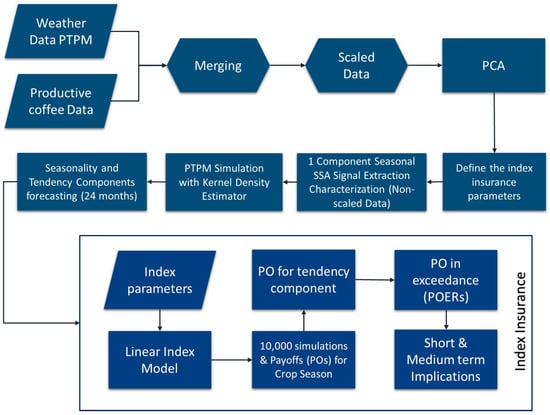 The methodology (Figure 1) used in this study combines statistical analysis, a PCA reduction process, SSA filtering, and forecasting kernel simulation for index and payout modeling using R [45], by: