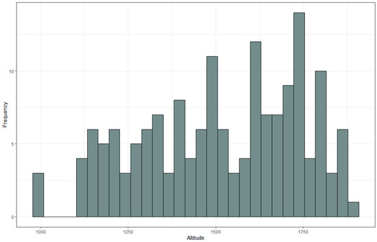 To diminish the basis risk associated with the difference between the data recording and the crop sites, we selected the weather stations near coffee-growing regions. As a result, we obtained data consisting of 163 meteorological stations whose altitude is between 1000 and 1890 m with a median of 1513 m above sea level. The distribution of altitudes is presented below (Figure 2). This graph shows that most stations are close to 1750 m above sea level, and there are fewer stations with an altitude of less than 1400 m.