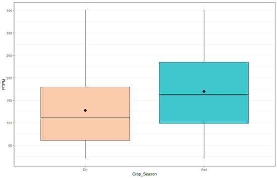 In Colombia, there are two seasons for coffee cultivation, dry and wet, and four productive zones in the country: eastern north, central north, central south, and south [18,19,20,21,22,23,24,25,26,27,28,29,30,31,32,33,34,35,36,37,38,39,40,41,42,43,44,45,46,47]. According to the sample data, the mean monthly rainfall in the dry season is 131 PTPM, while in the wet season, the mean is 168 PTPM. In addition, a boxplot shows that the dispersion of the data is similar between the two seasons, and in the case of the dry season, the data are more asymmetric (Figure 3).