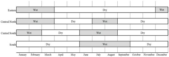 Weather seasons in Colombia per region. Source: Cenicafé, 2016 [47]. Note: eastern: Santander and eastern Cundinamarca; central north: Caldas, Antioquia, Risaralda, northern Tolima, and northern Cundinamarca; central south: Quindío, Tolima, Valle Cauca, and northern Huila; south: Cauca, Nariño, and Huila.