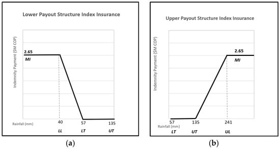 Indemnity structure for the lower and upper average PTPM. (a) Lower precipitation ranges, (b) upper precipitation ranges. Notes: (1) Low and high rainfall index insurance are annually seasonalized. (2) Lower limit (LL); upper limit (UL); lower threshold (LT); upper threshold (UT); and max indemnity (MI) [17]. Source: adjusted according to Abrego-P et al. [18].