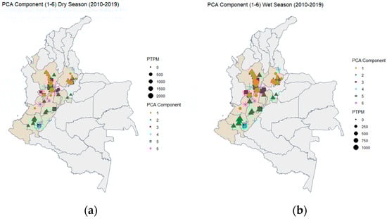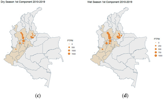 The departments that belong to the first component are Santander, Antioquia, Caldas, and Valle del Cauca (Figure 6c,d). The largest contribution of variance (15.3%) can be found in Samana in Caldas (Table 5 and Figure 7). The next location, with an 8% contribution of variance, is in Briceño, Antioquia, and then it is followed by San Francisco, Antioquia (7.1%), San Carlos, Antioquia (5%), and El Guacamayo, Santander (4%). The locations in Valle del Cauca have less than 1% of the contributions.