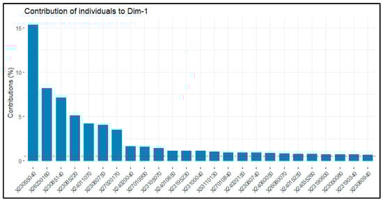 First PCA component contributions of individuals. Here, the weather stations and the percentage of variance contributions are identified. Source: author’s processing.