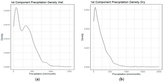 Kernel pdfs with n = 1000 points, results for 1st component in the (a) wet season and (b) dry season of monthly average rainfall values (2010–2019). Source: author’s processing.