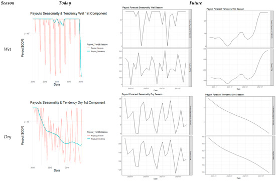 Considering the limitations that satellite data could exhibit for its use in index insurance models, such as the eventual lack of site calibration [28], weather station data has a high potential for this purpose. Index insurance models such as the one proposed here should be used in advance to calculate the expected future payments, which are related to the seasonal and trend components of each crop season. These may result in more efficient solutions for producers and insurers by knowing in advance the expected tendencies of disbursals and, with that, concerted and suitable timely insurance responses [61].