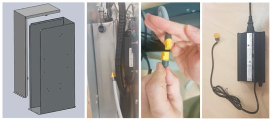 The battery pack consists of a 48 V module, which is made up of 112 cells (Samsung ICR18650-29E) with the following characteristics: nominal voltage 3.6 V; maximum current 4A (8A peak); 2500 mAh capacity (2900 mAh nominal); external section 18, 25 × 65 mm. The module is structured to have 14 groups of 8 cells in series in parallel and guarantee a nominal voltage of approximately 50 V; overall, the battery pack has a capacity of 1 kWh. The cells comprising the battery pack are housed in a case (Figure 6a) made of PLA filament with adequate thermal and mechanical resistance for the application in question. For connection to the battery pack, functional connectors are used for the specific requirements: connector for the PL082X-61-10 power supply (Figure 6b); connector for the BMS (Figure 6c); connector for the BMS temperature sensor (Figure 6d).
