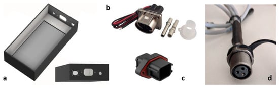 (a) Battery pack case; (b) rectangular connector for panel mount power supply, 2 contacts; (c) connector for BMS: automobilistic, 18 way, female, 13A, IP67 panel mount; (d) connector for temperature sensors with panel mount.