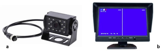 The closed-circuit video system is composed of a video acquisition system consisting of two video cameras (Figure 9a), positioned frontally to ensure appropriate frontal visibility of the maneuvering and passage area of the device, and a screen for video playback (Figure 9b) placed near the operator station. The system’s characteristics are 10.1″ IPS 1024*600 resolution screen; 2-channel HD display support; 720P HD video recorder support; 400 cd brightness; SD memory card slot (max. 128 GB); 16:9 image mode; 12–24 V power supply; approx. 7 W power consumption; operating temperature −20°–45 °C; weight 920 g.