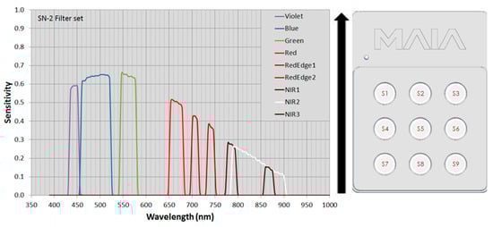 Table 1 reports the main characteristics of the 9 sensors of the MAIA multispectral camera in terms of central wavelength (CWL), bandwidth (BW), and color.
