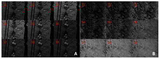 The phenomobile prototype system was used to acquire the multispectral signal of the plants. Figure 15 shows the output of the nine sensors. Using these data, the NDVI and GDVI indexes were calculated from Equations (2) and (3). These are shown in Figure 16, together with the RGB images obtained by combining the signal of sensors S1, S2, and S3.