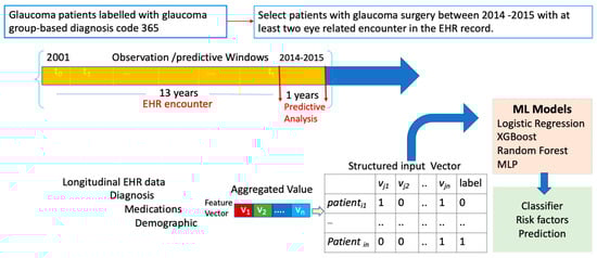 Conversely, medical treatment of systemic diseases—diabetes and hypertension—may have a multifactorial effect on glaucoma onset that has not always been examined in prospective or cross-sectional studies. It is noteworthy to mention that most of these studies were knowledge-based or hypothesis-driven, which suggests that a modest number of pre-set variables were included in their predictive analysis. With the extensive adaptation of electronic health records (EHR) and their supporting secondary use in research [17], we now have the opportunity to apply data-driven retrospective approaches to develop predictive models through understanding comorbidities that impact the onset of glaucoma and their related medications. Moreover, EHR data contains valuable information that can be used for many purposes, including decision-making support [18], prognosis markers for medical concepts [19], and risk assessment [20].