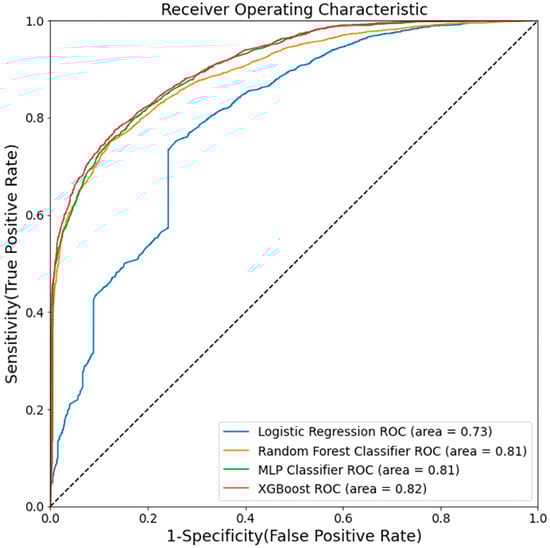 The data was analyzed using a machine learning library in the Python programming language. First, we randomly split the data into 80% training and 20% testing data for analysis. ML analysis performance was assessed using 5-fold cross-validation, which provides a robust and reliable measurement of model performance [31]. We used the listed parameters for each ML model, as shown in Table 1, for the entire dataset. We trained a series of four algorithms, including logistic regression (LR), random forest (RF), XGBoost (XGB), and multi-layer perceptron (MLP). The functionality of logistic regression, a parametric-based model, and the other models, such as RF and XGB, is non-parametric. We used a loss function, parameter estimation, and complexity reduction for each ML parameter listed in Table 1. These ML methods have been used in several predictive analyses [33,34,35] with a large dataset.