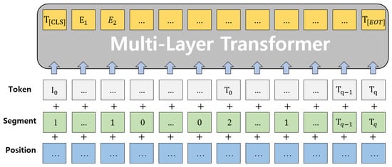 The second loss function predicts whether a vector is changed by changing the vector to a probability of 50% of the contaminated image. In Equation (2), D is randomly extracted data, w is an image description token, and h is an image object tag and a region vector. The above two loss functions are combined to learn about 4.1 million images and 6.5 million texts, and image object tags and image data are using from COCO data [], Conceptual Captions [], SBU Captions [], Flickr30k [], and GQA [] datasets.