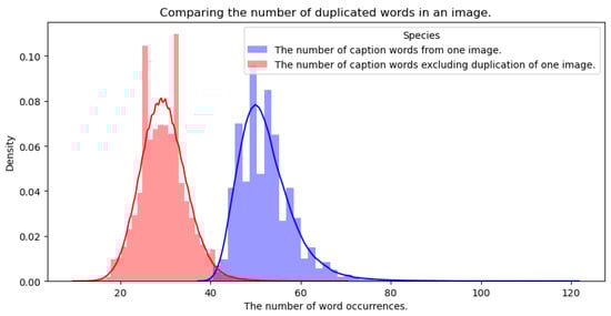 This paper learned using COCO captioning data []. COCO captioning data [] have been widely used to solve the image captioning problem in recent years. The COCO dataset has five image captions in one image and consists of 413,915 captions and 82,783 images’ learning data; 202,520 captions and 40,504 images’ evaluation data; and 40,775 captions and 179,189 test data. As shown in Figure 3, the average number of words generated per caption sentence is about 10.5. Based on the space, it is viewed as a single word, and the number of words generated from the image caption learning data is 43,360. In addition, there are five image caption data in one image, and each datum is a sentence unit. Among the image caption sentences generated in one image, there are sentences in which the meaning to be described overlaps. It is difficult to show quantitative values because it is sometimes ambiguous to check each sentence with overlapping meanings in the data to determine whether it is viewed or spoken with the same meaning. In this paper, by visualizing how many overlapping words there are in five sentences that explain an image (Figure 4), we intended to use a lot of limited words and indirectly show sentences with the same meaning.