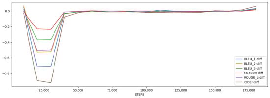 Table 2 shows the results of fine-tuning the filter captioning model, and Table 3 displays the results of fine-tuning the existing model. Each model was trained up to 180,000 steps and evaluated in units of 10,000 steps. In order to compare the results of the filter captioning model and the existing model, they are visualized and compared for each evaluation index. Figure 6 includes charts that visualize filter captioning models by score, and Table 2 and Table 3 show the results of fine-tuning of existing models. Both the existing model and the filter captioning model showed unstable scores in BLEU [], METEOR [], ROUGE [], and CIDEr [] at the beginning of learning and similar scores after 60,000 steps. The filter captioning model is well learned.