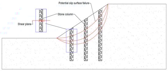 - Abusharar, S.W.; Han, J. Two-dimensional deep-seated slope stability analysis of embankments over stone column-improved soft clay. Eng. Geol. 2011, 120, 103–110. [Google Scholar] [CrossRef]
