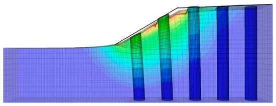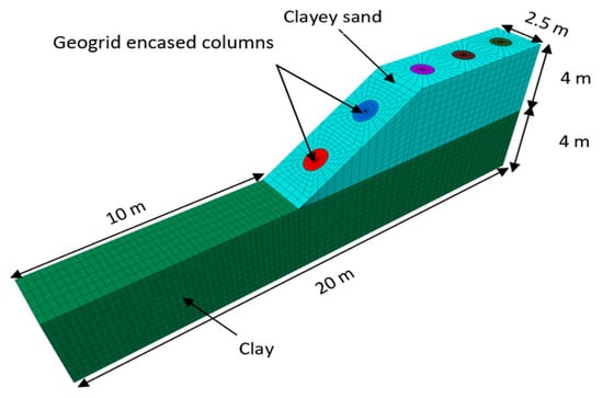 An upper sandy soil with the dimensions of (7 m length 3.85 m width 4.5 m depth) and lower sandy soil with the dimensions of (8 m length 3.85 m width 4.5 m depth) mesh was created. Four granular columns in a square pattern with a spacing S = 2.5D (center to center) were used as seen in Figure 2 and Figure 3, where S is the spacing center to center between the columns and D is the diameter of the granular columns. The shear plane was predefined at 4.5 m from the bottom elevation to consider the worst-case scenario where the applied force has pure horizontal effects on the shear plane. By using the symmetry provided by FLAC3D, a half of the above-mentioned geometry was created to minimize the time required for solutions. The extensions of the required soil were made by using a brick element. For the geogrids—6336 nodes—have been created in addition to 50,535 nodes for the soil and the granular columns. Moreover, 8736 nodes have been used to construct the interface between the sand and the geogrid. The same properties in Table 1 were used in the current study, however, different values for the angle of friction and dilation angle for the column material and the sand were used; (43, 37) and (13, 7) degrees, receptively.
